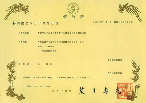 - 바이오게르마늄 생합성공법 특허취득 (일본)
